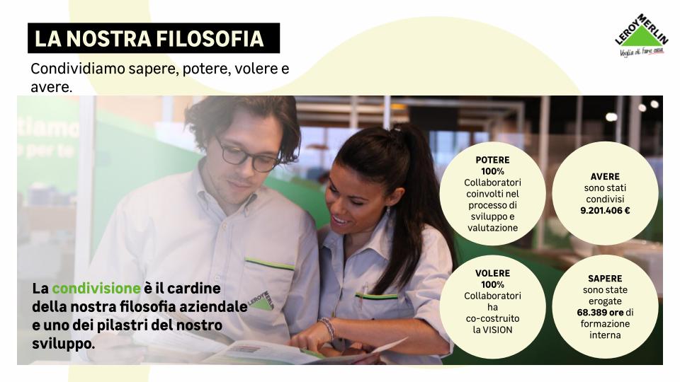 - IL SENSO DELLA CONDIVISIONE: la volontà di aumentare la conoscenza, l’autonomia e l’avere collettivo e individuale. Formare e informare, delegare e responsabilizzare, condividere i risultati economici perché tutti siano imprenditori.