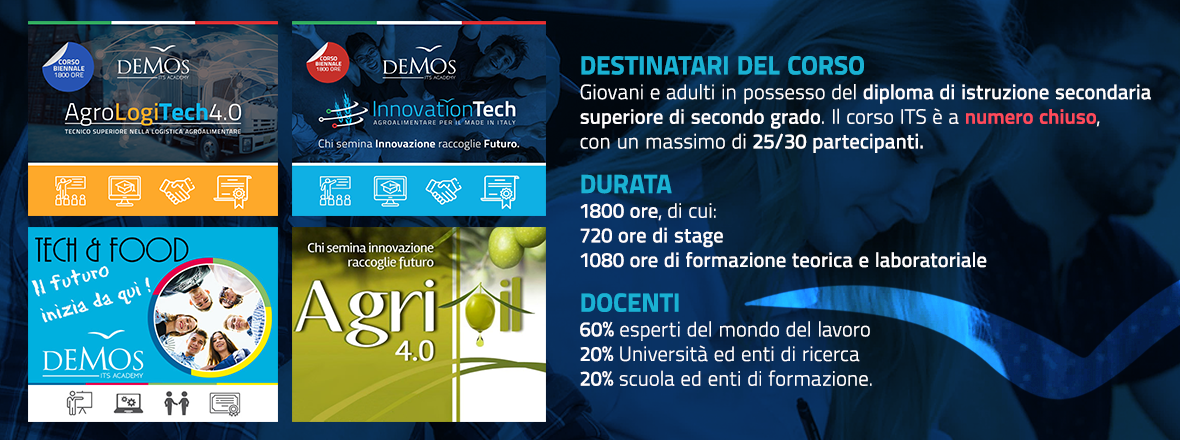 A partire da gennaio 2018 l’ITS D.E.Mo.S. Academy ha attivato dei laboratori di formazione e innovazione mirati a far collaborare studenti, docenti e personale delle imprese delle diverse specializzazioni settoriali dell’agroalimentare.