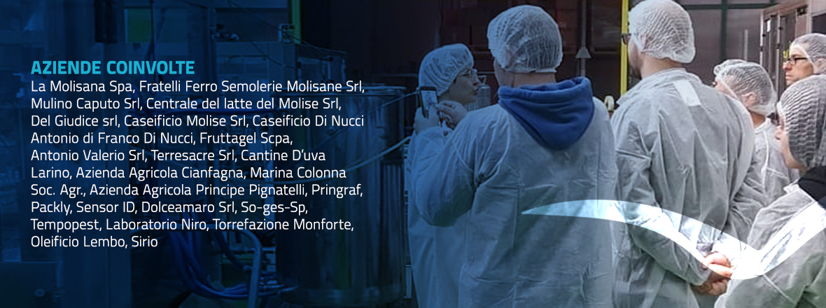"La Molisana spa”, “Fratelli Ferro Semolerie Molisane S.R.L.”, “Mulino Caputo srl”, "Centrale del latte del Molise srl”, “Del Giudice srl”, “Caseificio Molise srl”, “Caseificio Di Nucci Antonio di Franco Di Nucci”, “Fruttagel scpa”, “Antonio Valerio srl”, “ Terresacre srl”, “Cantine D’uva Larino”, “Azienda Agricola Cianfagna”, “Marina Colonna Soc. Agr.”, “Azienda Agricola Principe Pignatelli”.