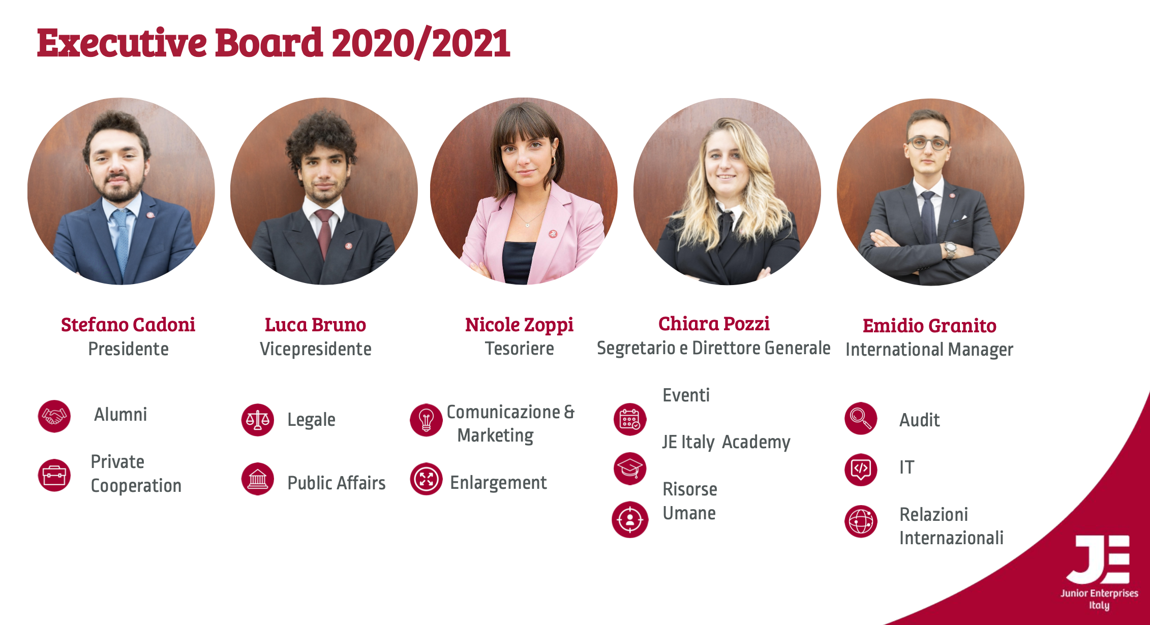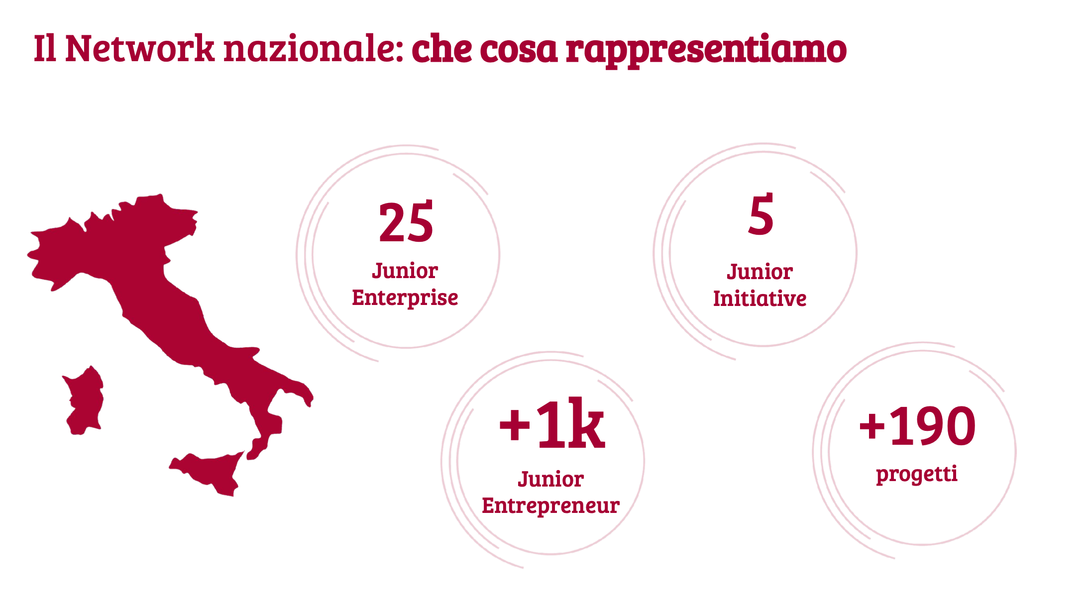 Junior Enterprises Italy è la Confederazione Italiana delle Junior Enterprise, fondata nel 1992. Ci occupiamo di dare supporto alle realtà italiane nel loro lavoro affinchè il marchio “Junior Enterprise” continui ad essere un sinonimo di qualità. La nostra missione consiste nel garantire la continua crescita delle Junior del nostro network e favorirne la nascita di nuove. Rappresentando il Movimento in Italia e all’estero, la nostra confederazione si propone come un punto di contatto tra le JE per incoraggiare l’integrità del network nazionale e lo scambio di best practice.